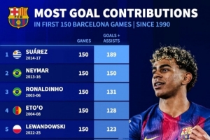 1990年以来巴萨生涯前150场直接参与进球榜:(图片来自本场比赛赛前)