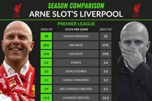 25-26赛季:32轮,胜率47%、负率31%,场均1.6分,场均1.6进球、1.3失球,场均创造2.1重大机会、创造12.3机会,净胜球+10,场均对方禁区内触球35次,联赛排名第5