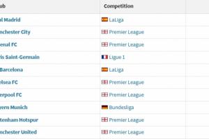 附欧洲身价前十俱乐部(单位:欧元):